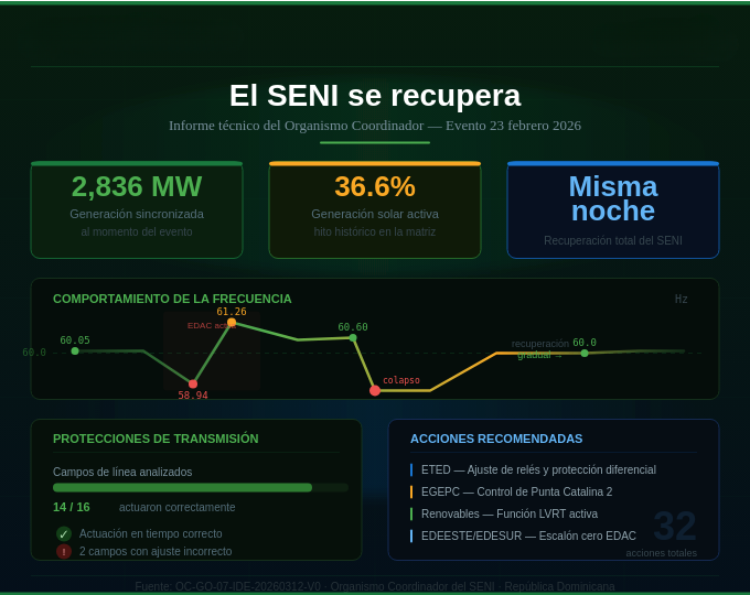 El Organismo Coordinador publicó un informe técnico exhaustivo que revela cómo las inversiones en protecciones del SENI limitaron el alcance de la falla y permitieron restablecer el servicio en horas. El documento también establece 32 acciones concretas para fortalecer el sistema eléctrico dominicano.